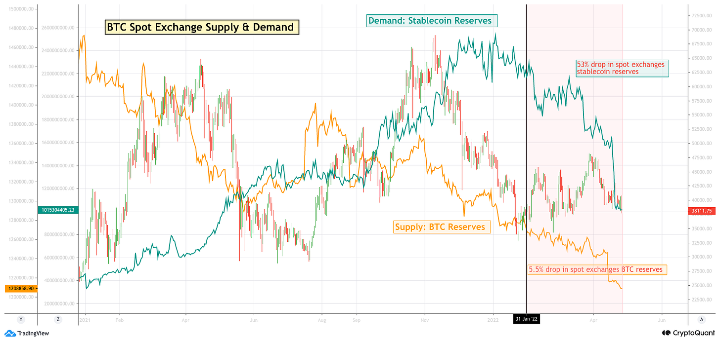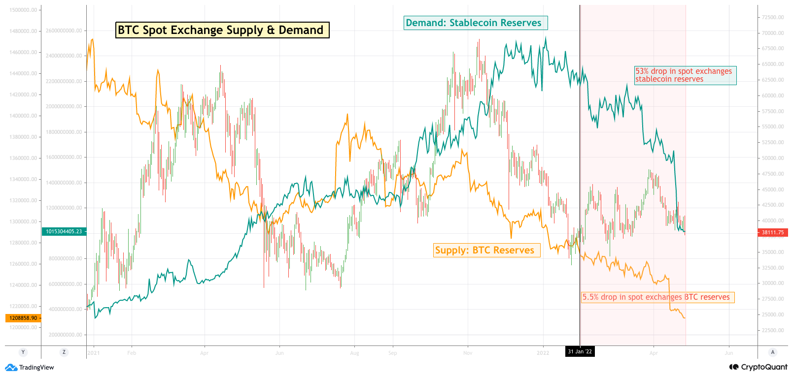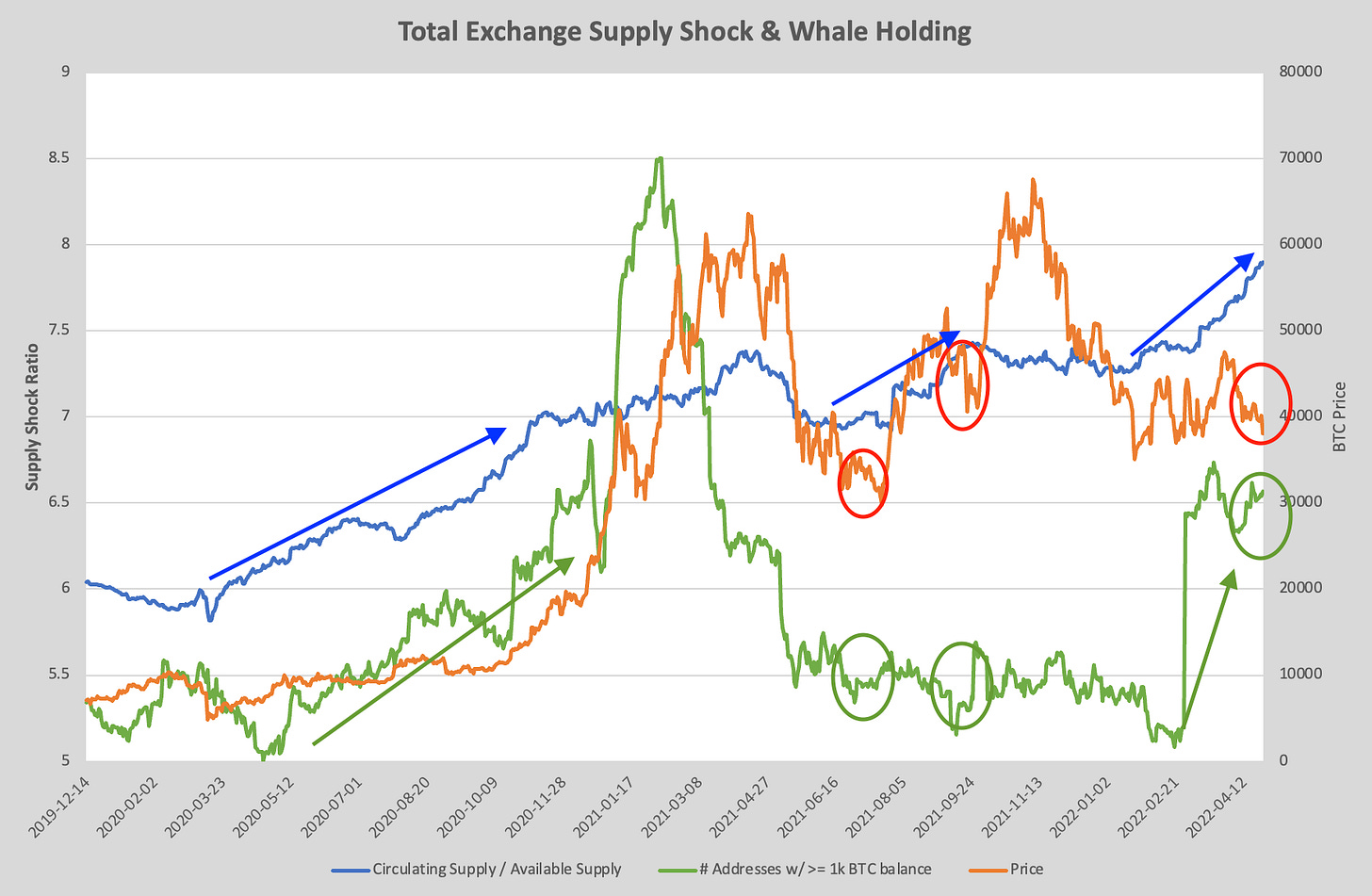 Exchange supply shock has increased significantly since January this year (blue line above). First proposed by Willy Woo, such metric measures the ratio of available BTC supply for sell compared to total BTC supply. The higher the ratio, the fewer amount of BTC is available to sell on the market and decreasing supply potentially leads to price increase.