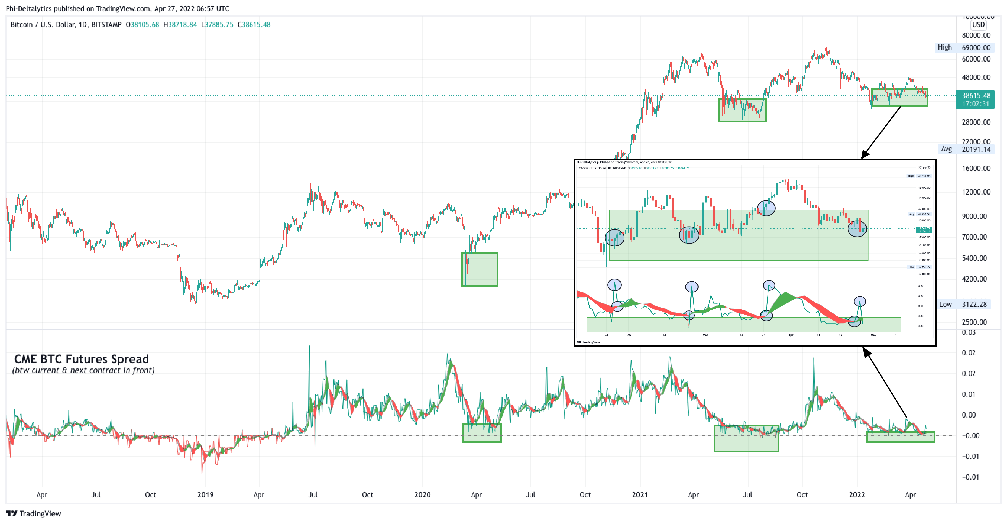 The spread has been at its all time low since mid 2019, which indicates there’s currently not much incentive for institutions to drive down BTC price from the futures market. Furthermore, indicated from the zoomed-in chart above, peaks in the futures spread had led to mid-term BTC price rallies. These all point to a bullish May ahead.