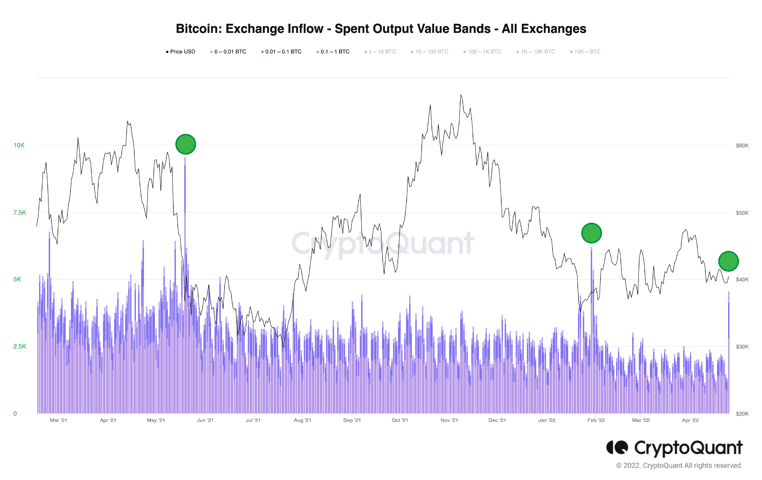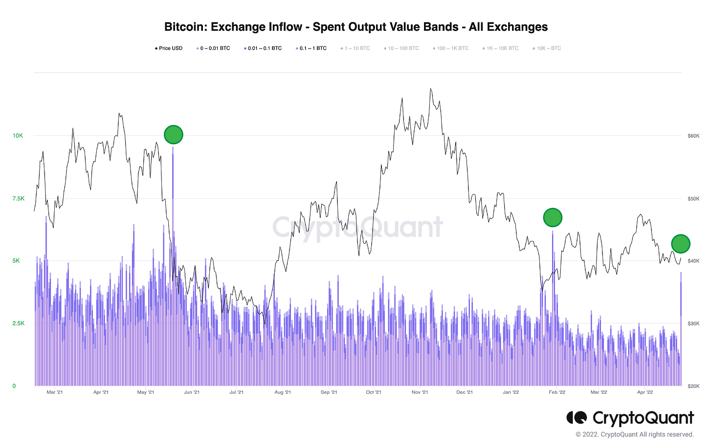 The largest amount of retail capitulation since February was seen in this past week. This happens when retail traders panic and deposit their BTCs to exchanges to sell for cash. While not signaling an uptrend, such capitulation is a sign of local bottom forming.